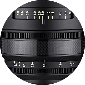 Designed to 114mm standard front diameter size it is easily compatible with 4x5 Matte Box. All scales, including focal length and aperture values, are on both sides of the lens and with the luminous font that glows in the dark, enabling convenient verification and operation, even in low light environments. 300 ° wide focus gear rotation angle makes you adjust focus minutely.