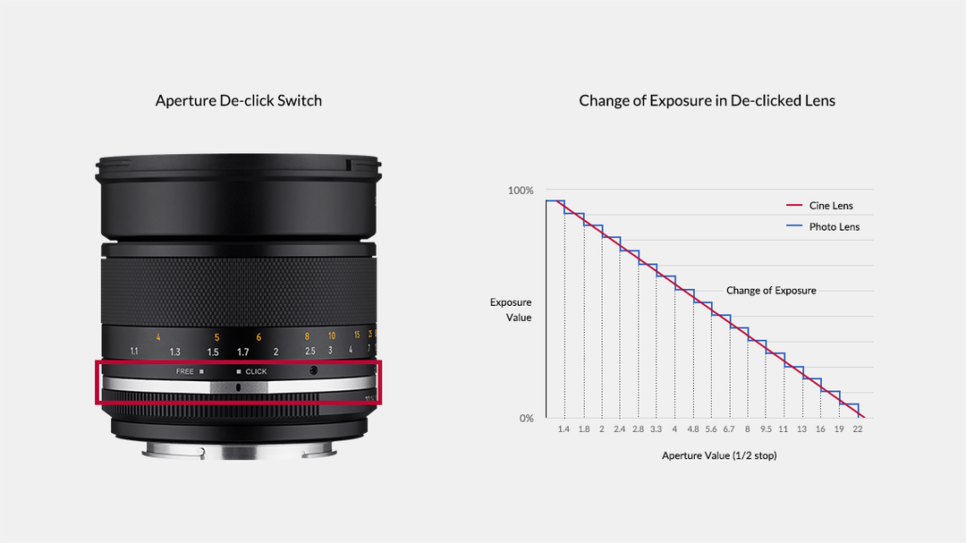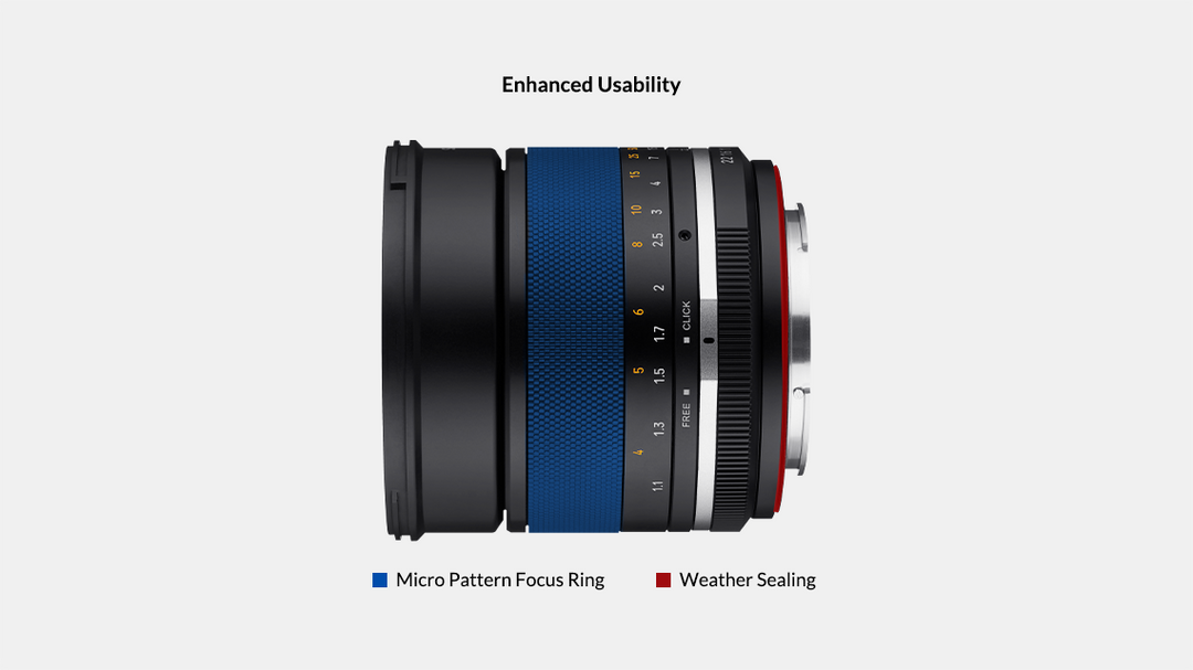 SERIES II ROKINON lenses include weather sealing, an aperture de-click switch for smooth and silent operation during video, a rubberized micro pattern focusing grip, and a nine blade circular aperture for greater bokeh. In addition, the focusing control action has been modified with a smoother, perfectly damped long throw for precise follow focus when shooting video.