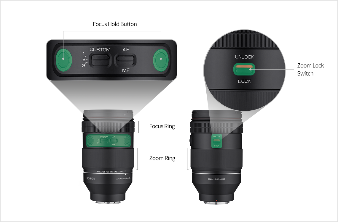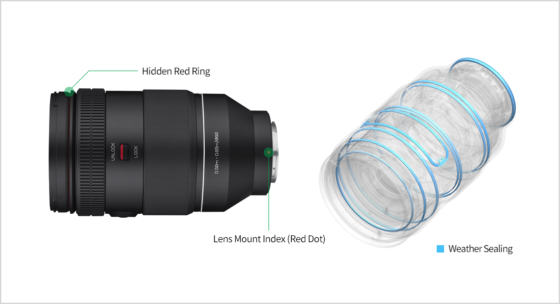 The 'Hidden Red Ring', which upgraded Rokinon's premium design to the next level, makes the lens even more attractive. As it is the L-mount lens, it adopts the red dot lens mount index. In addition, by applying a metal barrel, the build quality was improved and the lens was made more robust. A zoom lock switch helps users keep the lens set at its shortest 35mm position, making it more convenient and safe to carry.